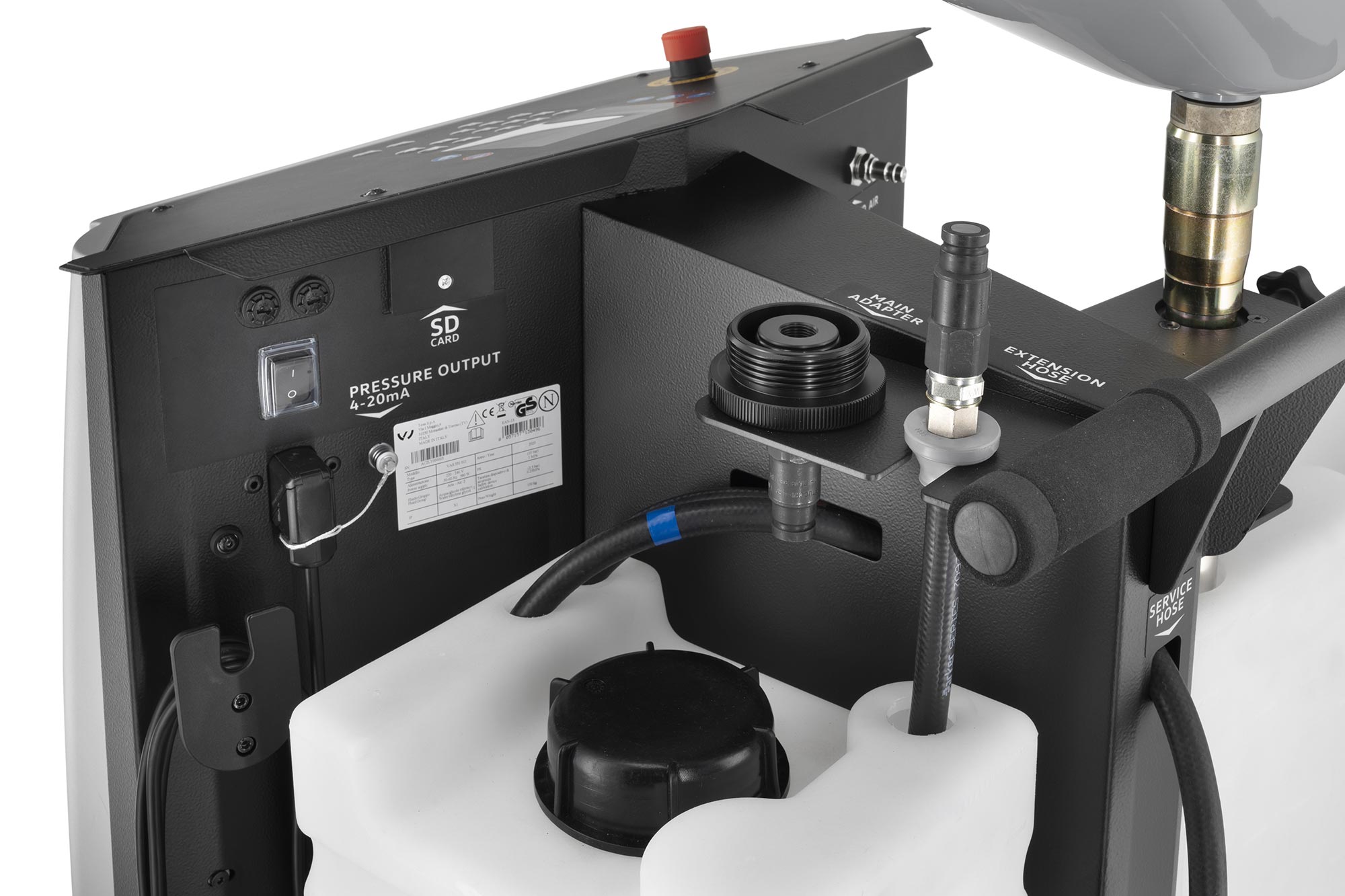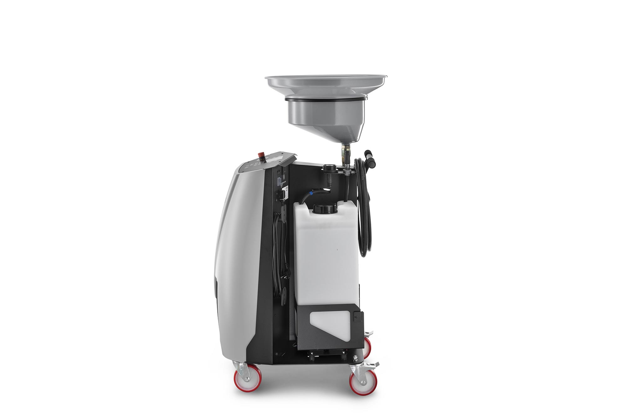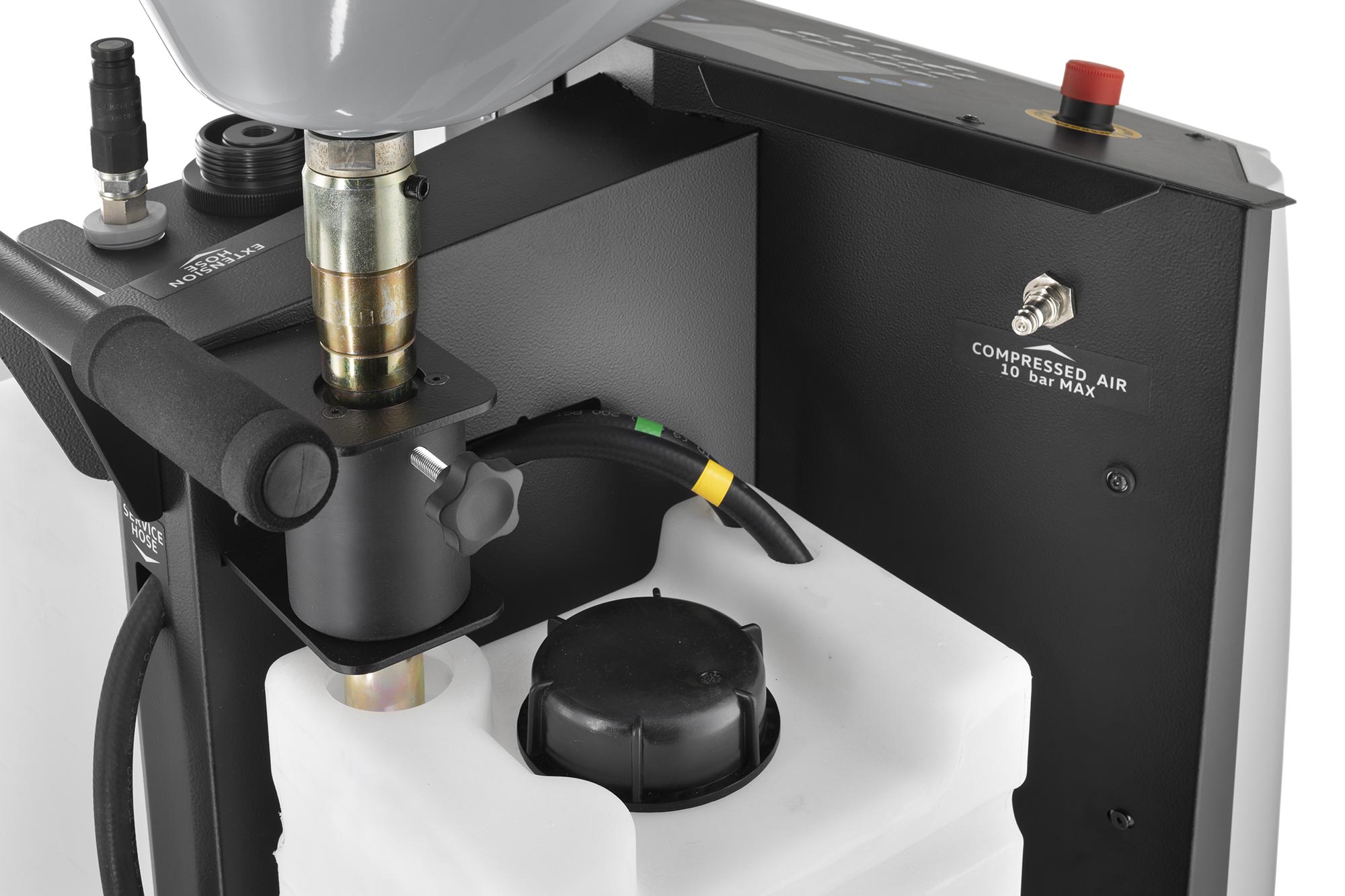 Using eFLUID VAS 531 011 is extremely easy. Just connect it to the coolant fluid expansion tank using the service hose it is equipped with, and then position and raise the vehicle on the workshop's lift. The operator can easily move the equipment, thanks to the practical castors it is equipped with, and position the telescopic funnel under the discharge plug, starting to drain the water-glycol mixture by gravity. This procedure is completed and enhanced by the function that allows eliminating any possible residues by flushing the system: blowing compressed air into the expansion tank and spreading it uniformly inside the pipes.